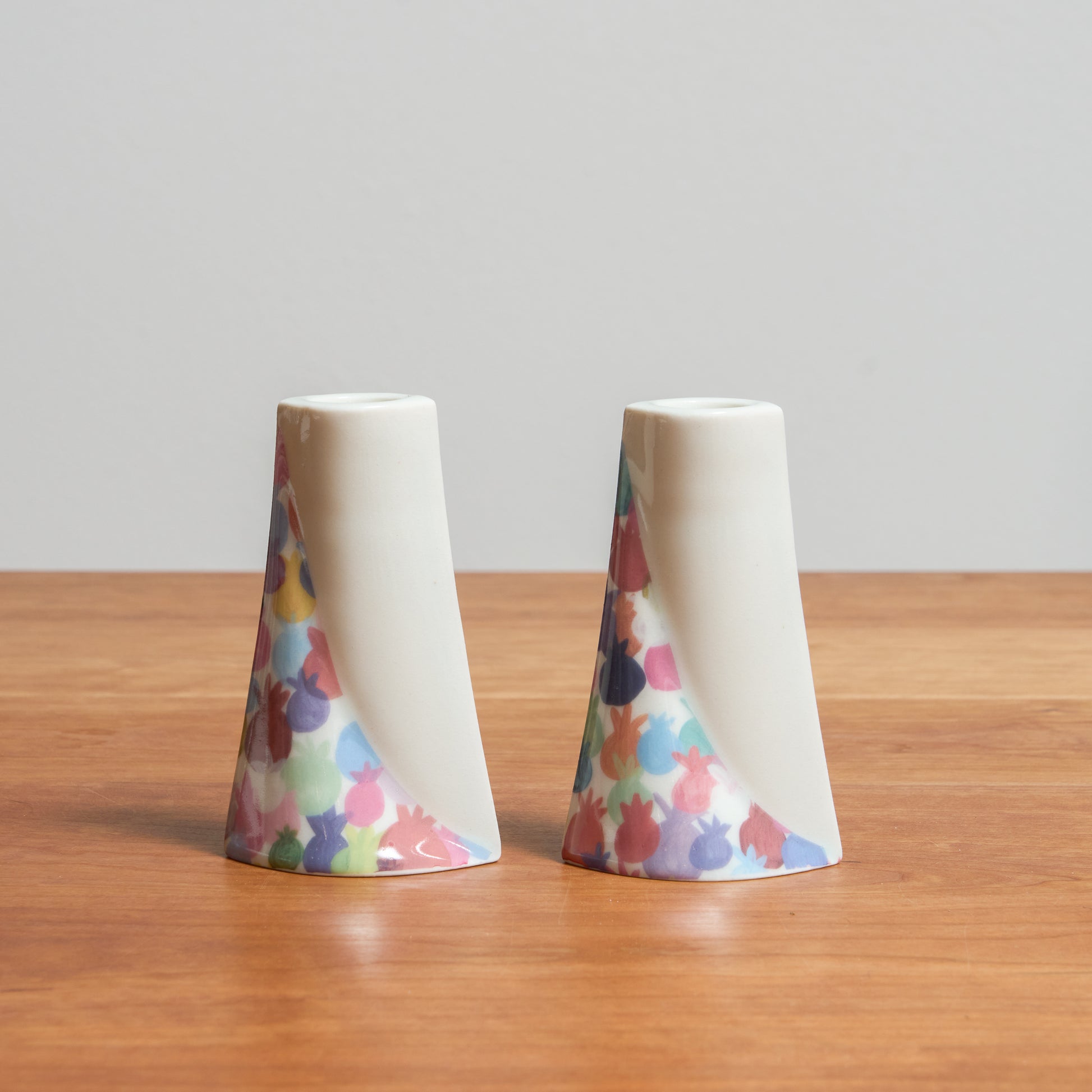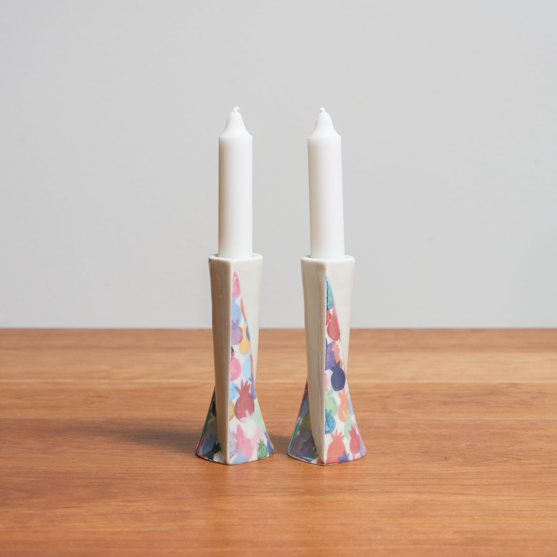 My 5" Shabbat candlesticks with Arielle Zorgers signature Rainbow Pomegranates design. These porcelain candlesticks are slipcast by hand in porcelain and finished with a soft blue glaze. Designed to hold standard Shabbat candles.