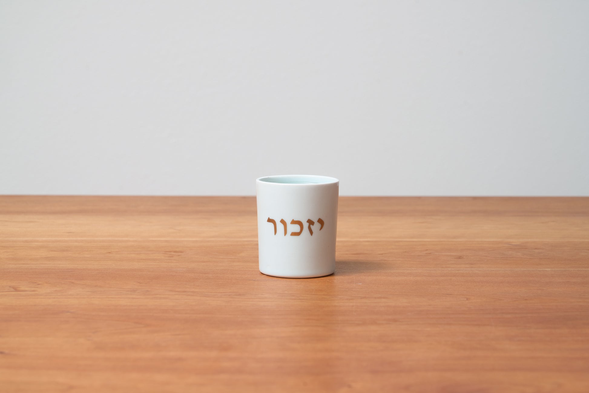 Honor memory with light. This minimalist porcelain Yahrzeit candle holder is adorned with “יזכור” (Yizkor) in elegant gold Hebrew lettering—meaning “Remember.” A timeless vessel for annual remembrance, it holds a standard 24-hour memorial candle and adds a dignified presence to any shelf or mantle. Handcrafted with care for sacred moments of reflection.